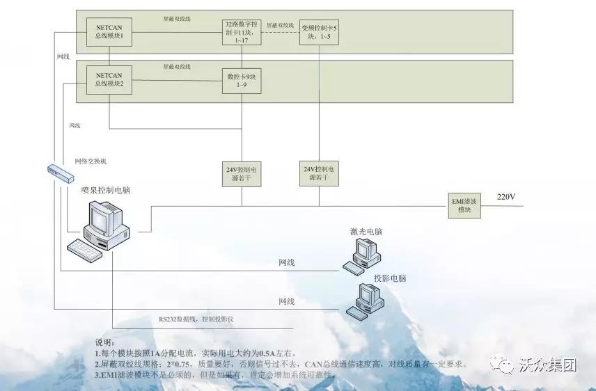 于經理表示:沃眾在噴泉領域有著獨特的優勢,公司擁有多位高技術骨干及人才、多位從事多年噴泉制造的工程師,為噴泉項目提供了雄厚的技術力量。除此之外還有我們的技術優勢:整體升降浮體技術, 單點控制技術等多種技術運用 ;綜合控制技術的精確控制 4大工序,20多種組成工序 幾十種大小組件。從大小工藝上沃眾都要求精益求精。除此之外還有我們先進的技術接口具有MIDI接口(MIDI鍵盤和MIDI時間碼,接收和發送),可以TCP或者UDP數據包調用,另外就是我們的ARTNET接口接入風力傳感器,溫度傳感器,以及其他感應開關。最后一個就是手動功能,分區表演功能,強制手動和關閉功能,定時功能,一臺電腦上可以運行多個噴泉軟件等等。